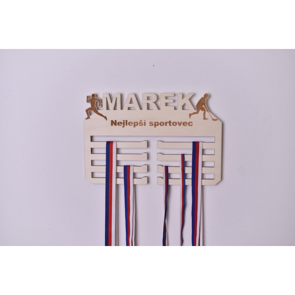 Zvolte jméno nebo přezdívku sportovce, která bude umístěna na horním okraji dřevěného věšáku na medaile. Součástí jména může být např. i číslo dresu! Vedle jména umístíme siluetu sportovce. Není problém zvolit i více než jeden sport nebo např. siluetu opačného pohlaví. Uprostřed věšáku vygravírujeme jakýkoliv text - sportovní motto, citát, zajímavou myšlenku a nebo název a znak sportovního týmu či klubu.
